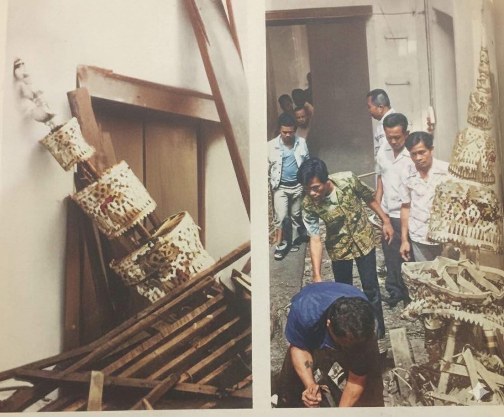 ฉัตรพระธาตุทองคำน้ำหนัก 110 กิโลกรัม ซึ่งได้ทำพิธีอัญเชิญไปประดิษฐานไว้บนยอด พระธาตุใน พ.ศ.2497 ได้ตกกระเด็นไปพิงอยู่ที่ฝากำแพงหอพระแก้ว ได้รับความเสียหายเล็กน้อย